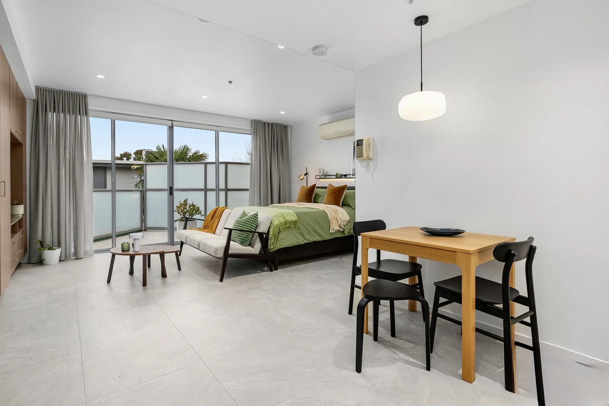 A sunlit 35 sqm studio with modern finishes, oversized north-facing balcony, and secure storage cage. Fully furnished and perfectly placed near St Kilda Beach and Acland Street’s cafés, dining, and nightlife.