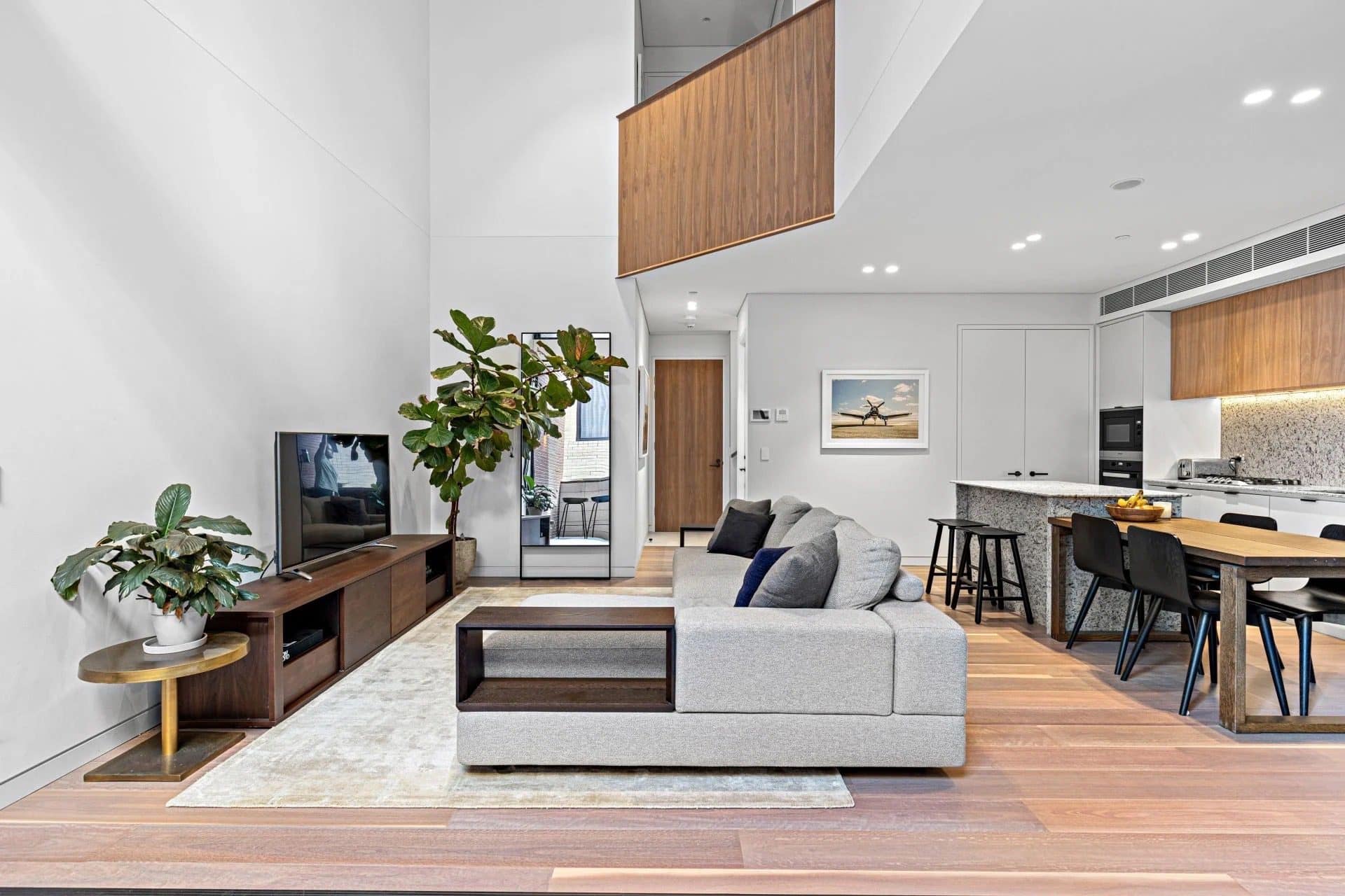 This luxurious executive apartment at Quay Quarter Lane is a masterpiece of modern design, crafted by renowned SJB Architects. Spanning 91 sqm over two storeys, the residence features 5-metre double-height windows that flood the open-plan living area with natural light, offering a blend of sophistication and practicality.